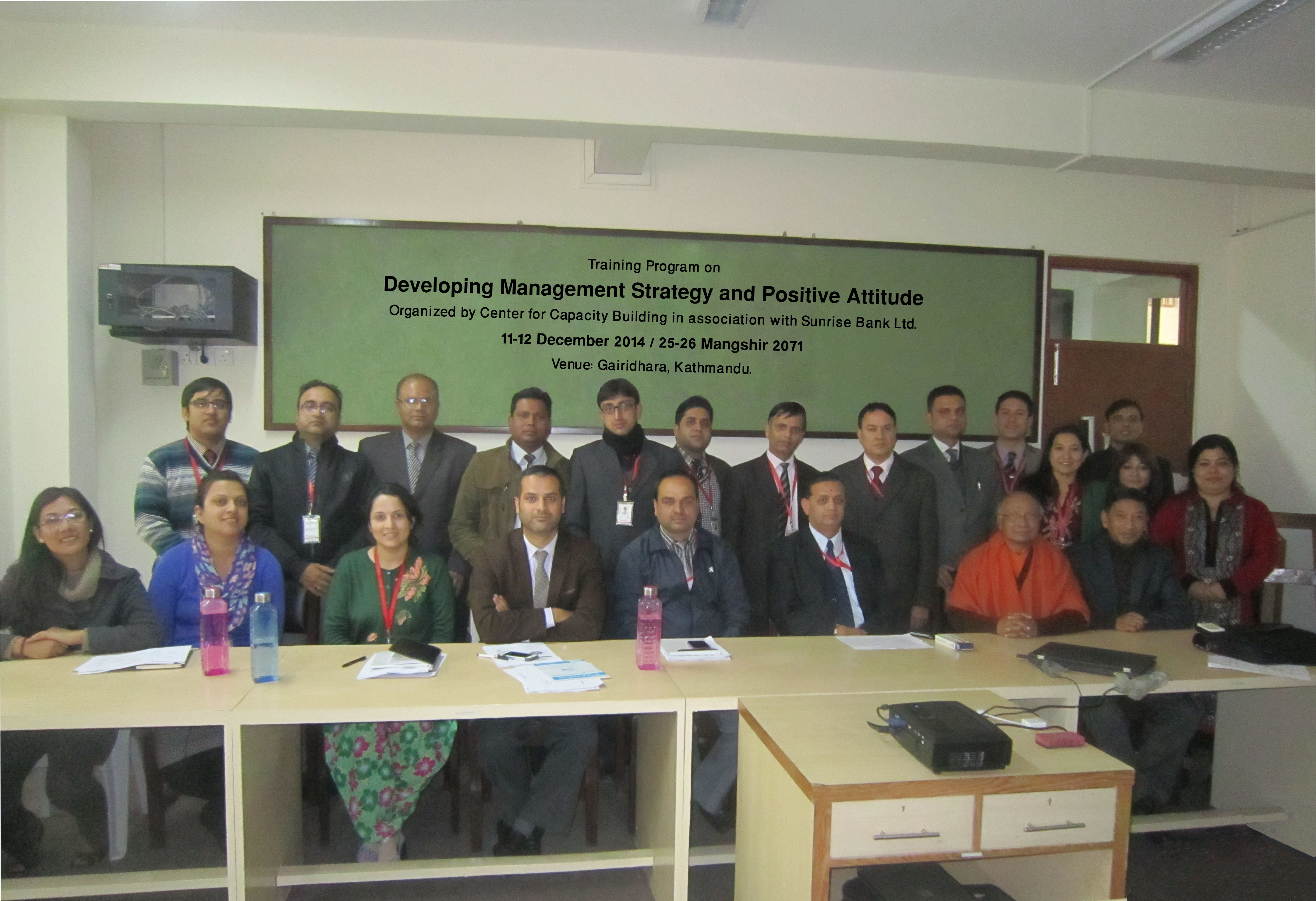 Training in Developing Management Strategy and Positive Attitude was organized on 11-12 December 2014 / 25-26 Mangshir 2071 at the Training Hall of Sunrise Bank Ltd., Gairidhara, Kathmandu for twenty branch managers and department managers of Sunrise Bank Limited with full technical and professional support of Center for Capacity Building/CECAB.