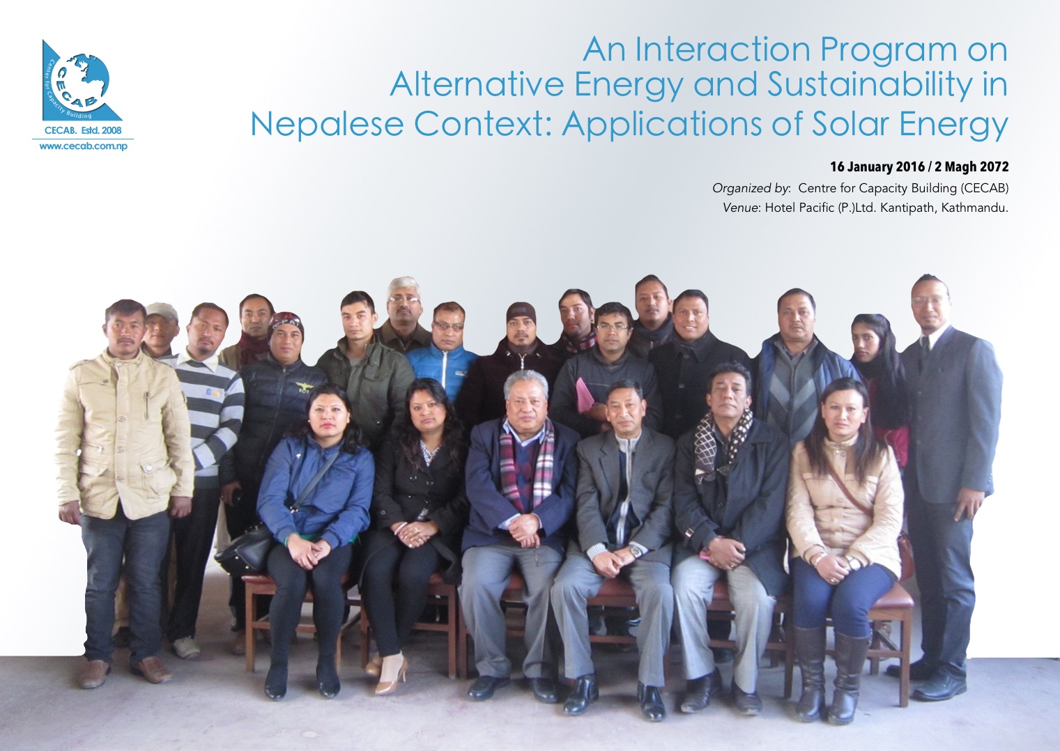 Centre for Capacity Building (CECAB) organized an interaction program on Alternative Energy and Sustainability in Nepalese Context: Applications of Solar Energy on 16 January 2016 / 2 Magh 2072 (Saturday) at Hotel Pacific (P.) Ltd. Kantipath, Kathmandu with the purpose of sharing knowledge on solar energy applications in Nepal. In this regard, the main objectives of the program were mainly: